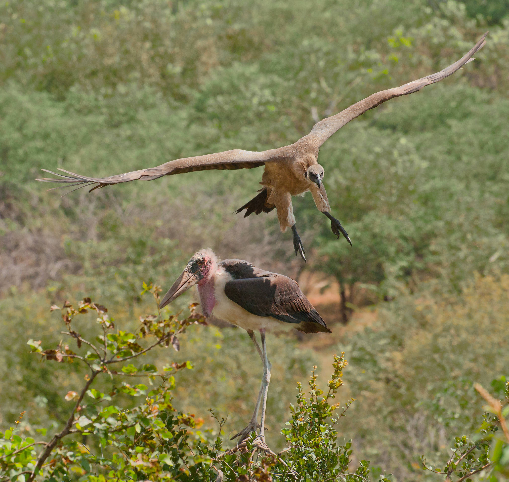 Hooded Vulture overhead a Marabou Stork
